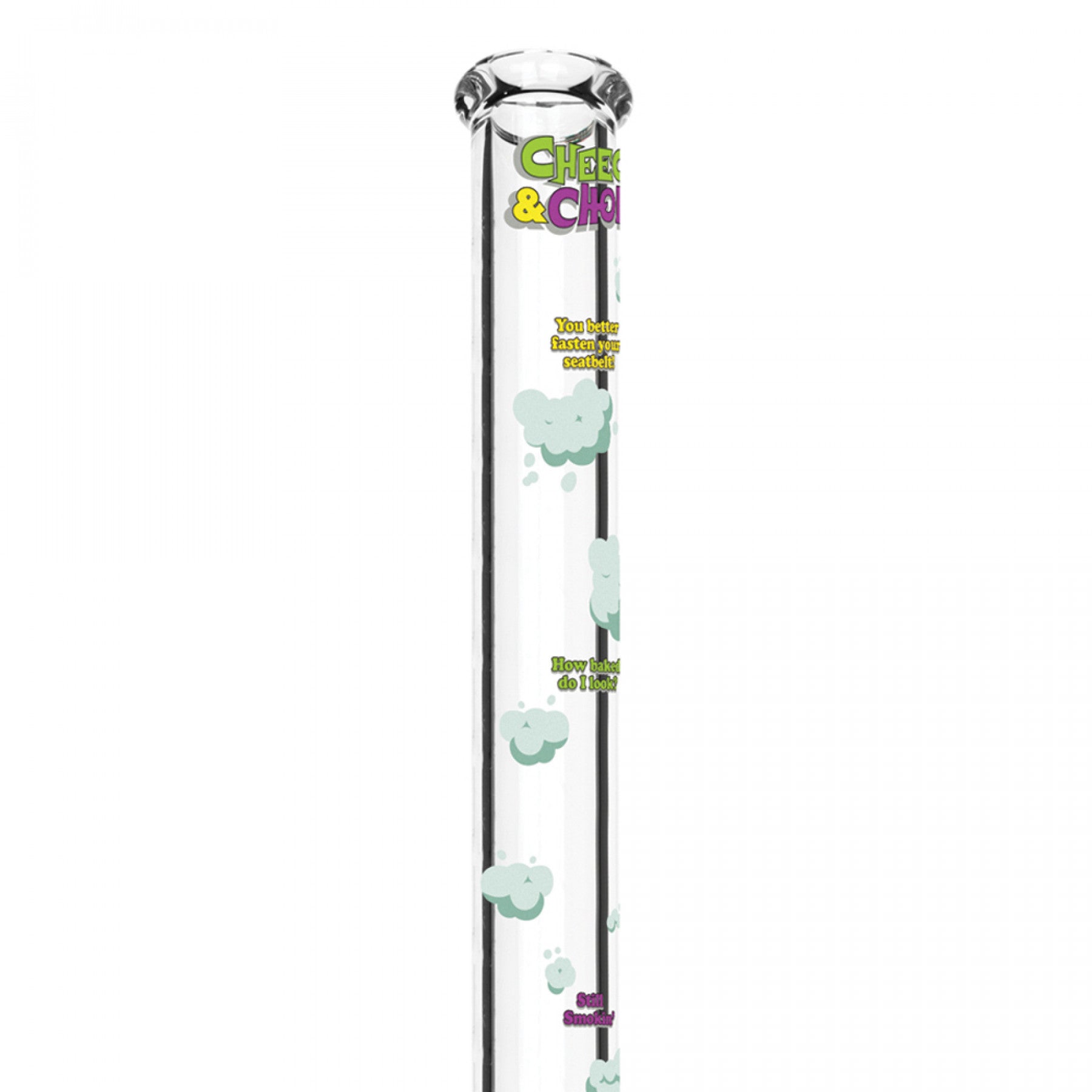 Show your pals who's boss in the stoner realm with this massive four-foot-tall bong from CHEECH & CHONG® GLASS. The 7mm thick design boasts a strong bell-base and marker challenges to track your toke train. One puff from this beast and you'll feel like you're cruising, but really you're just parked! Prove you can hang with Tommy and Cheech with this XXXL water pipe!