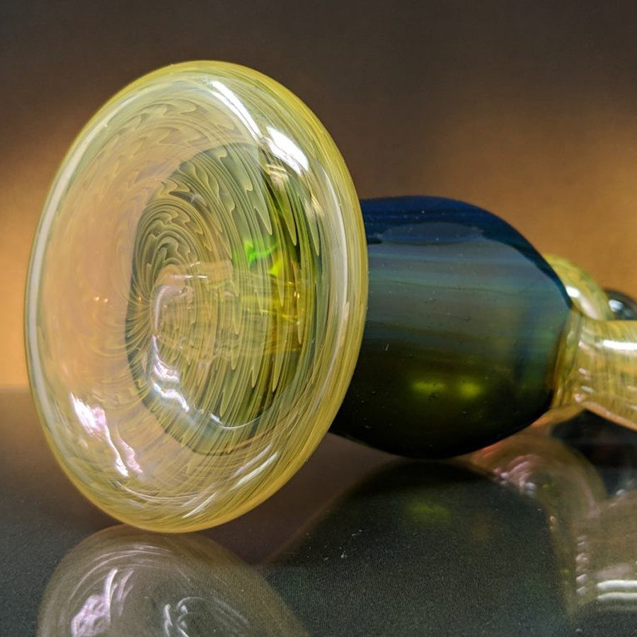 Hippos Glass rig with alien tech can and neck with fumed wrap and rake sections. Featuring an implosion marble on the back accompanied by a giant tumbled opal and signature hippo milli. 10mm handmade joint with 2 hole diffuser. Stands approximately 7.5'' tall.