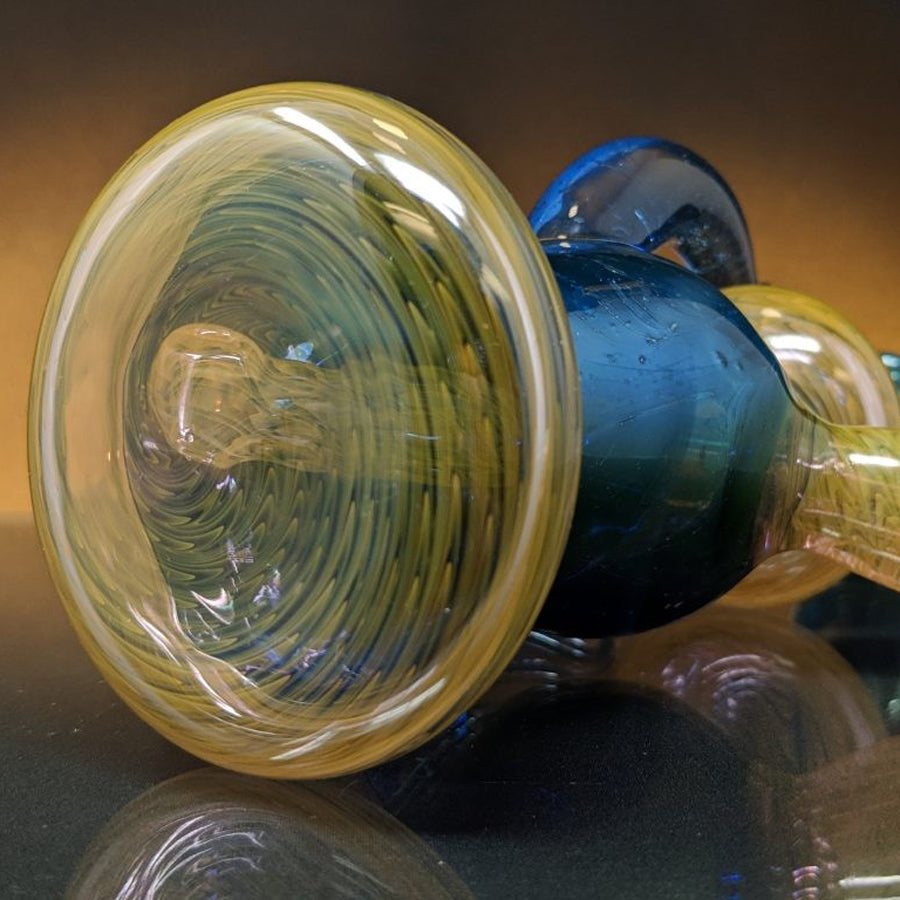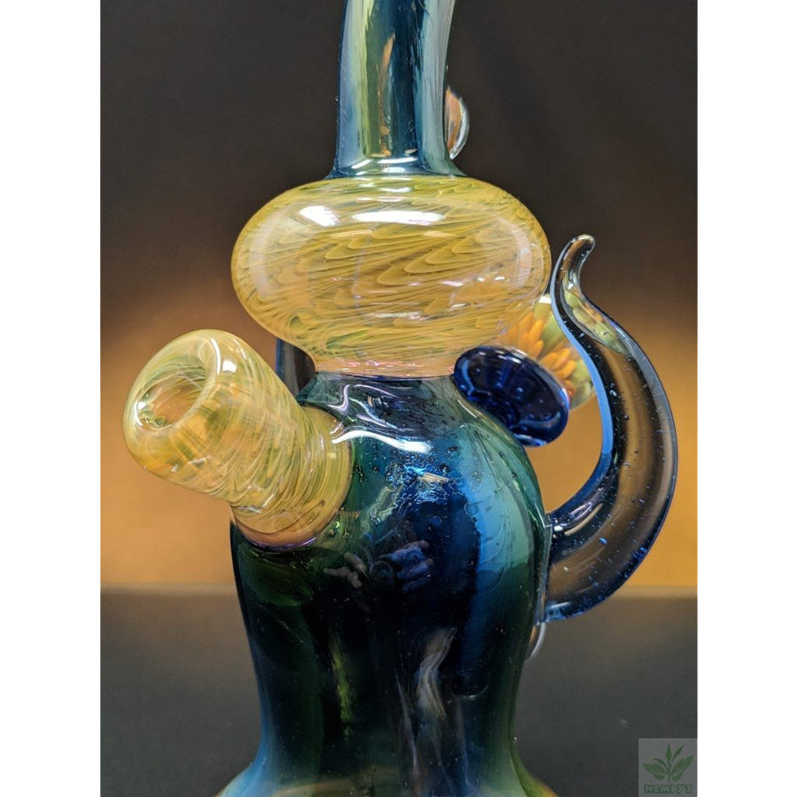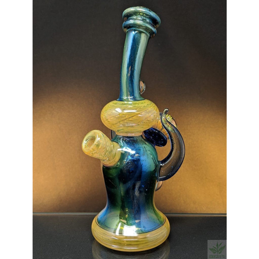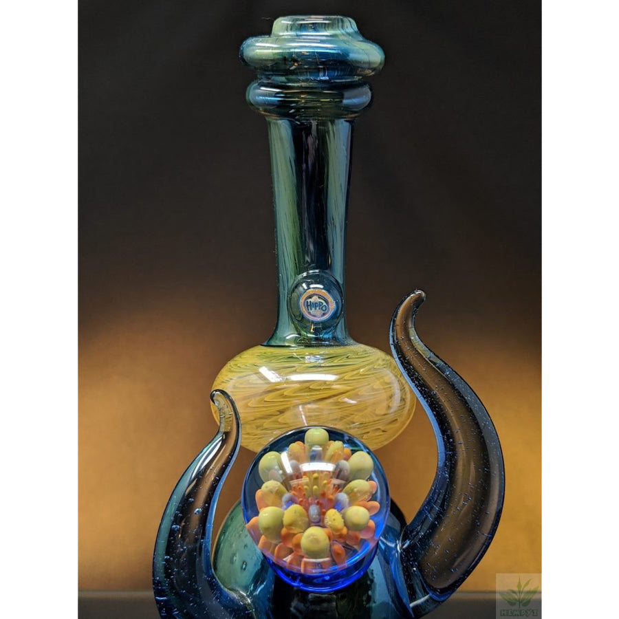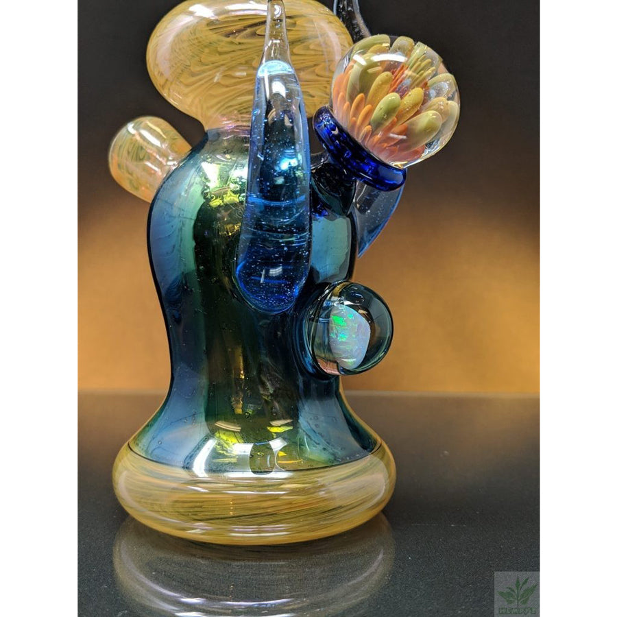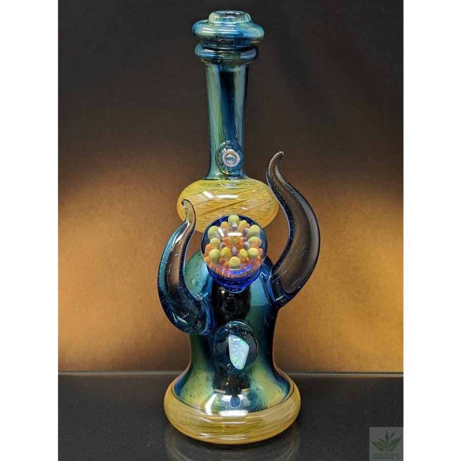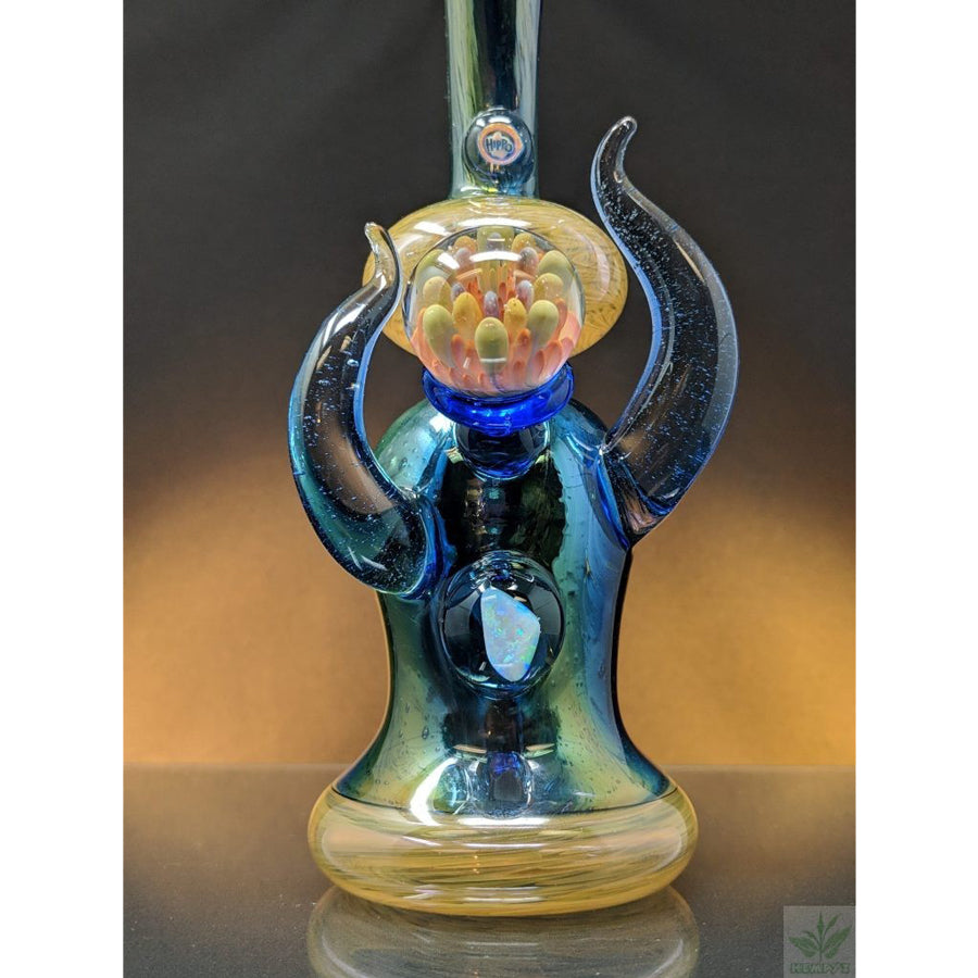 This beauty is made by the BC local, Hippo Glass. This fumed space rig features three raked fume sections, two decorative horns, a large chunky opal, an implosion marble, and his classic branded milli. It has a 2 hole diffuser stem build in and a handmade 10mm joint.