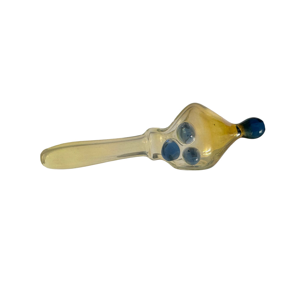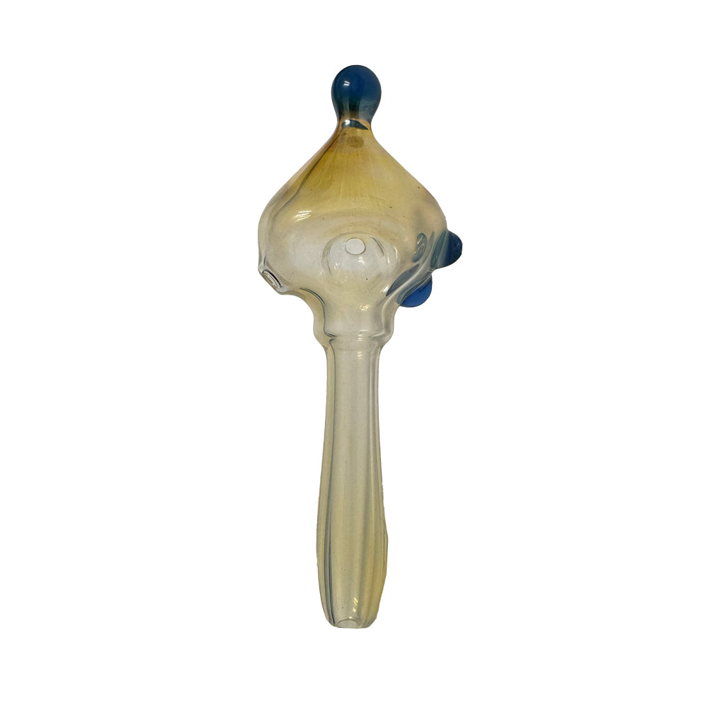 This Intent Fume spoon pipe is made using "colour change" silver glass. As resin builds within, the glass reflects a blue/purple hue. The design also includes a carb hole for smooth and airy tokes. The product is crafted by a skilled Canadian artist, Intent Glass.