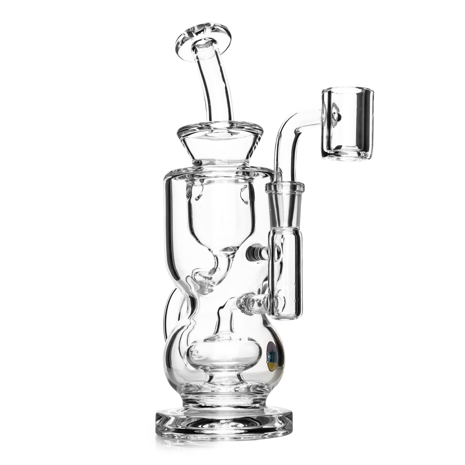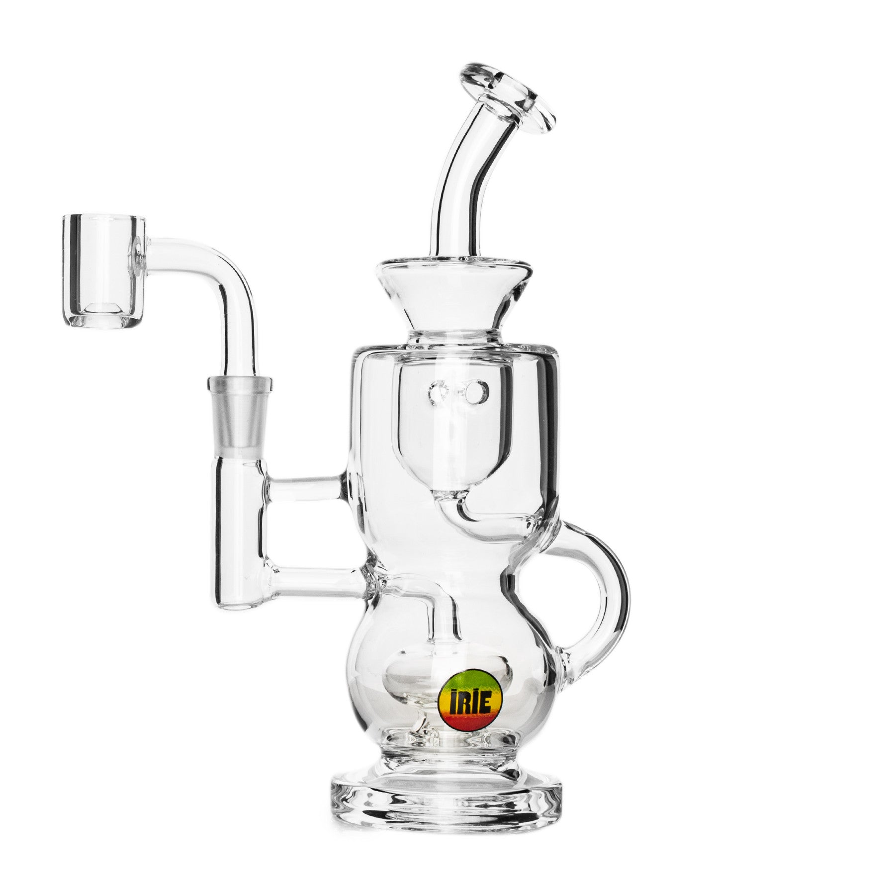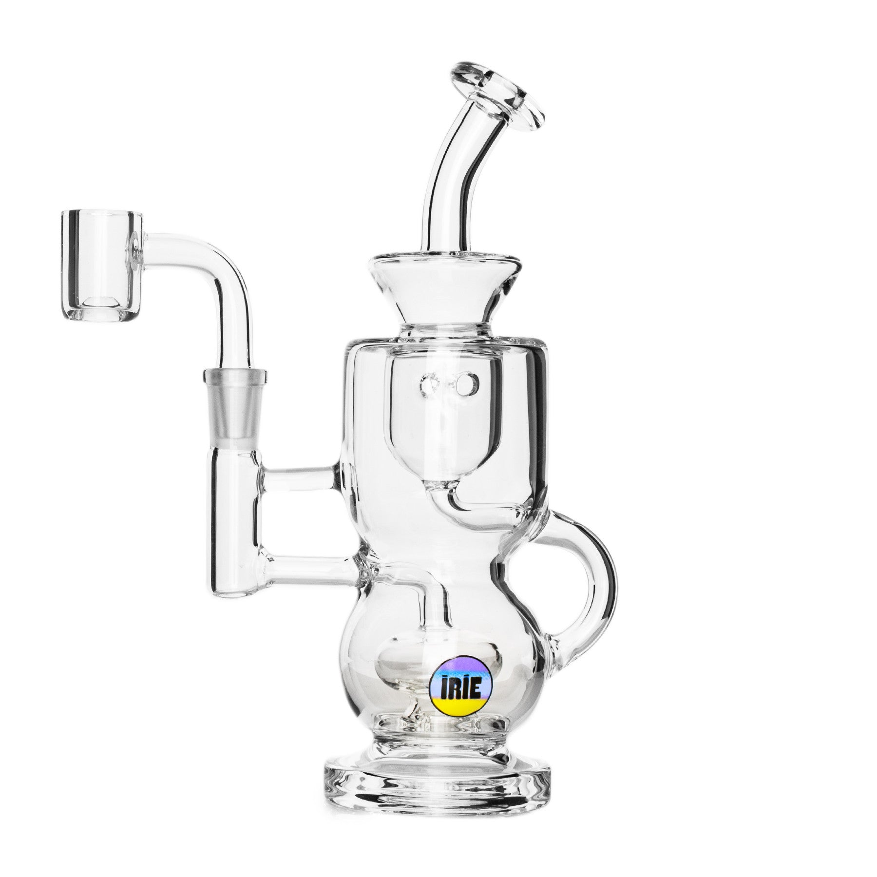 Get lit with this fresh, tiny dab rig from iRie™. Made with sturdy borosilicate glass, this compact rig has a trippy recycler design and comes with a quartz mini banger. Small size, big fog!