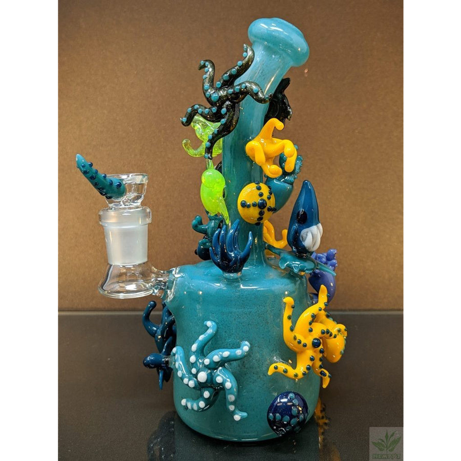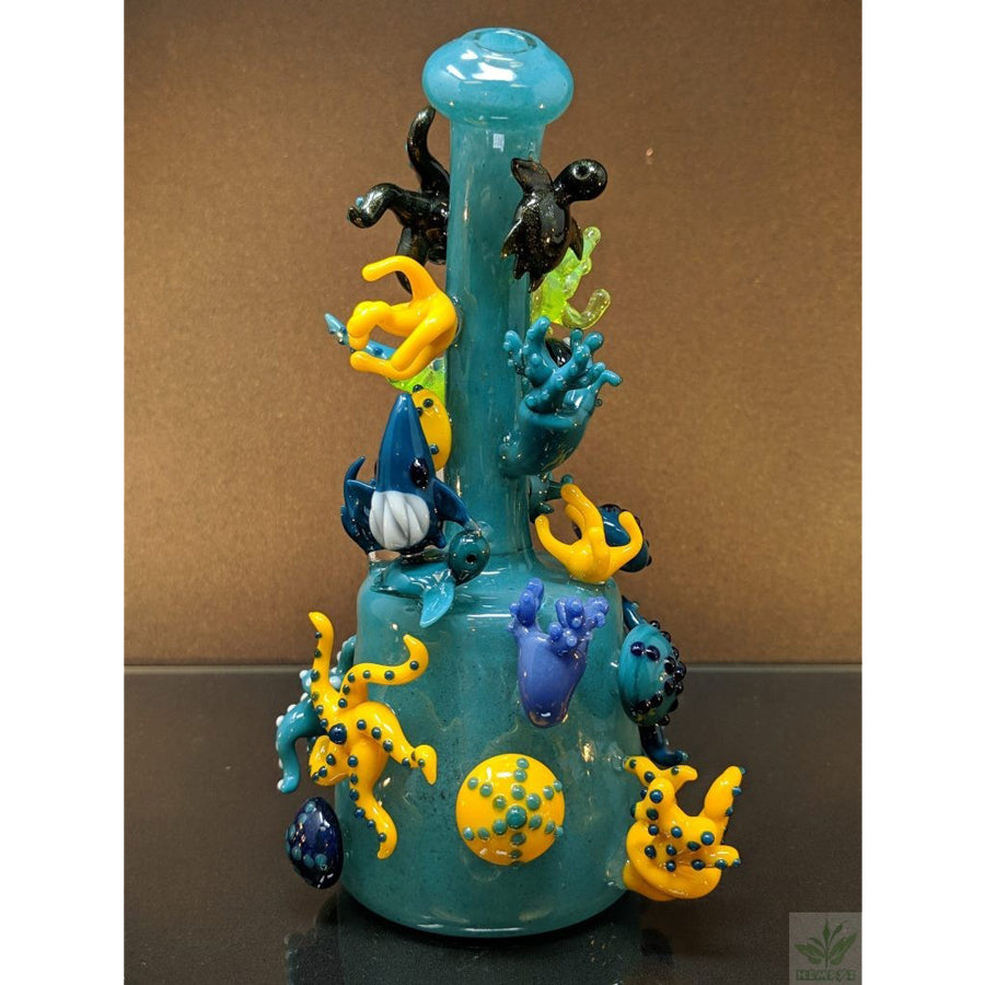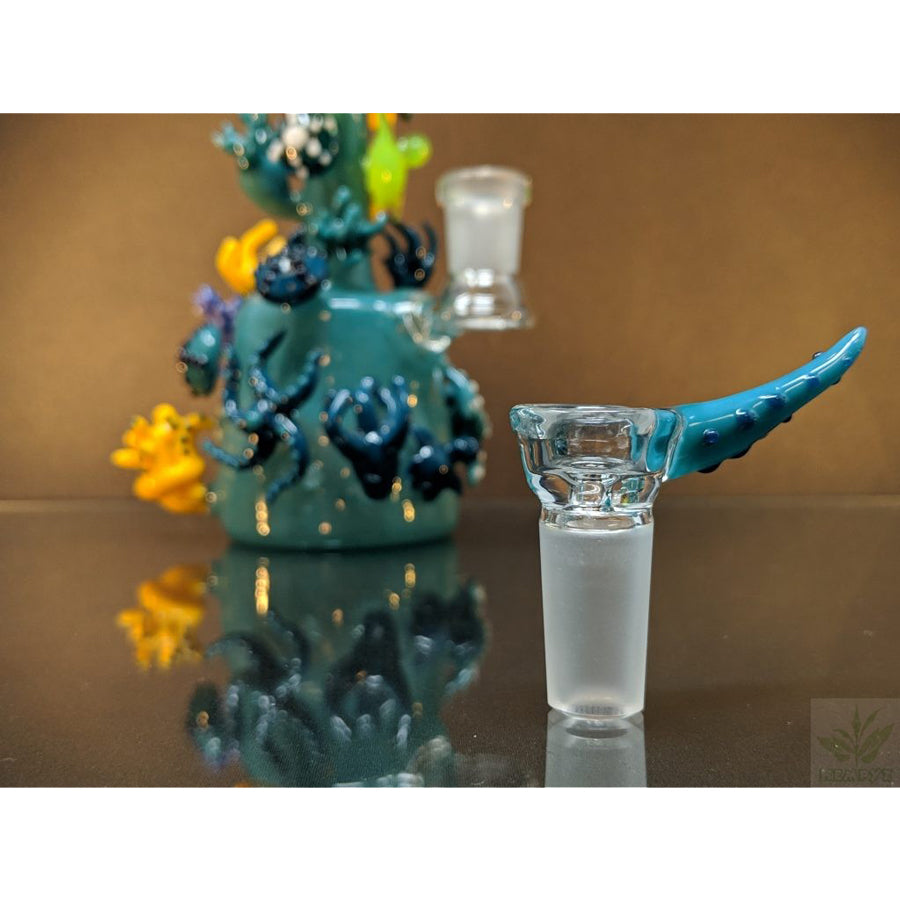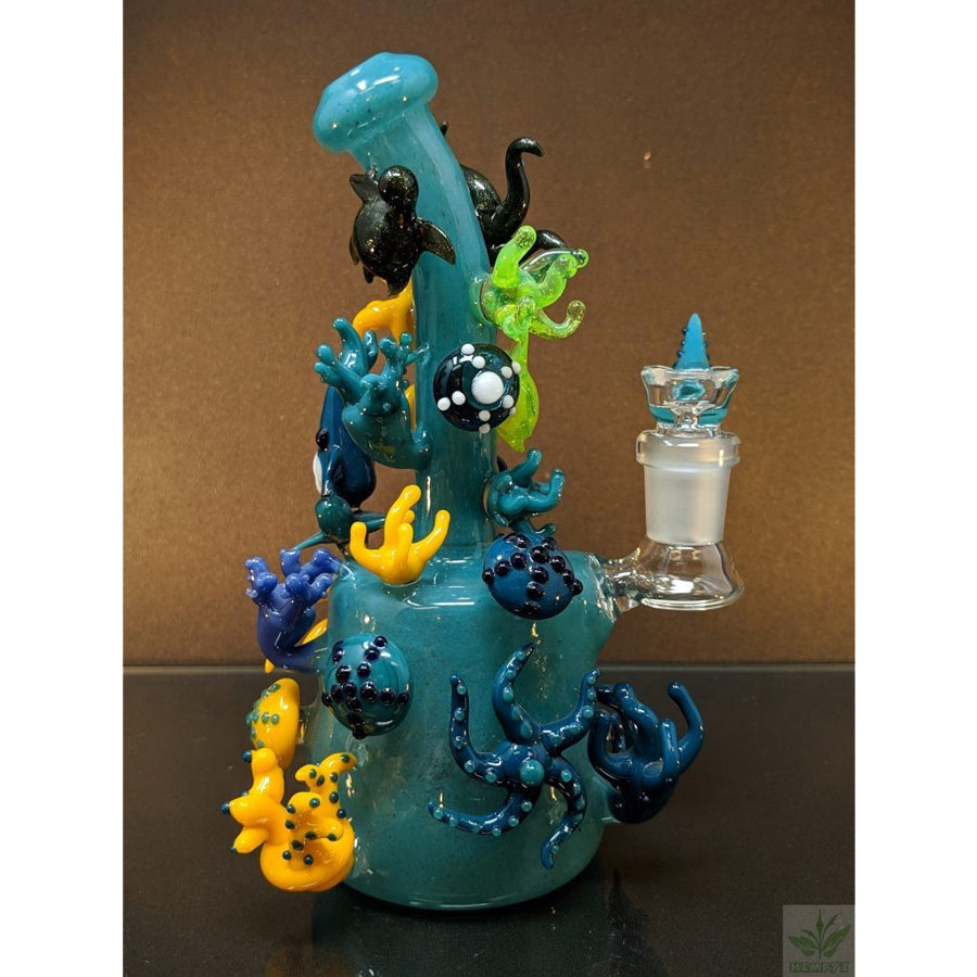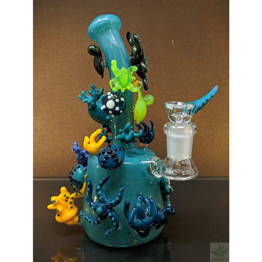 This mini tube by Kahuna Glass is called "Blending In" because of his signature Scalien hidden within the underwater scene. This piece could be used as is with the included 14mm bowl, or you could swap it out for any 14mm concentrate attachment.