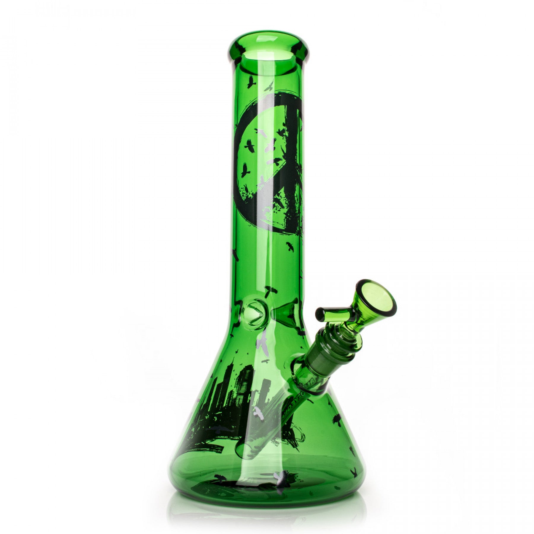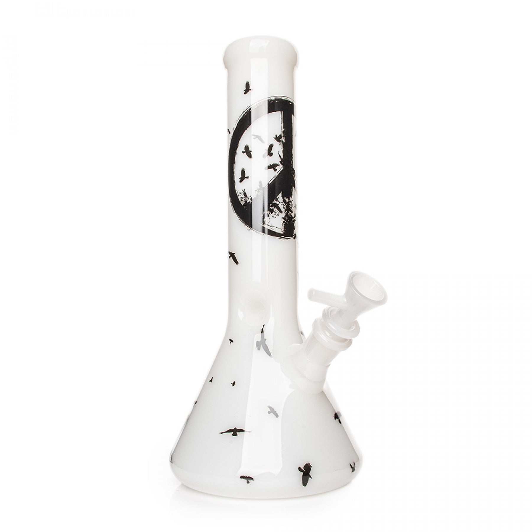 Fly high with the Red Eye Glass® Crow Beaker Base Water Pipe! This pipe boasts a flock of crows, complete with cityscape and peace-sign decals, all topped off with a smooth and inviting mouthpiece.