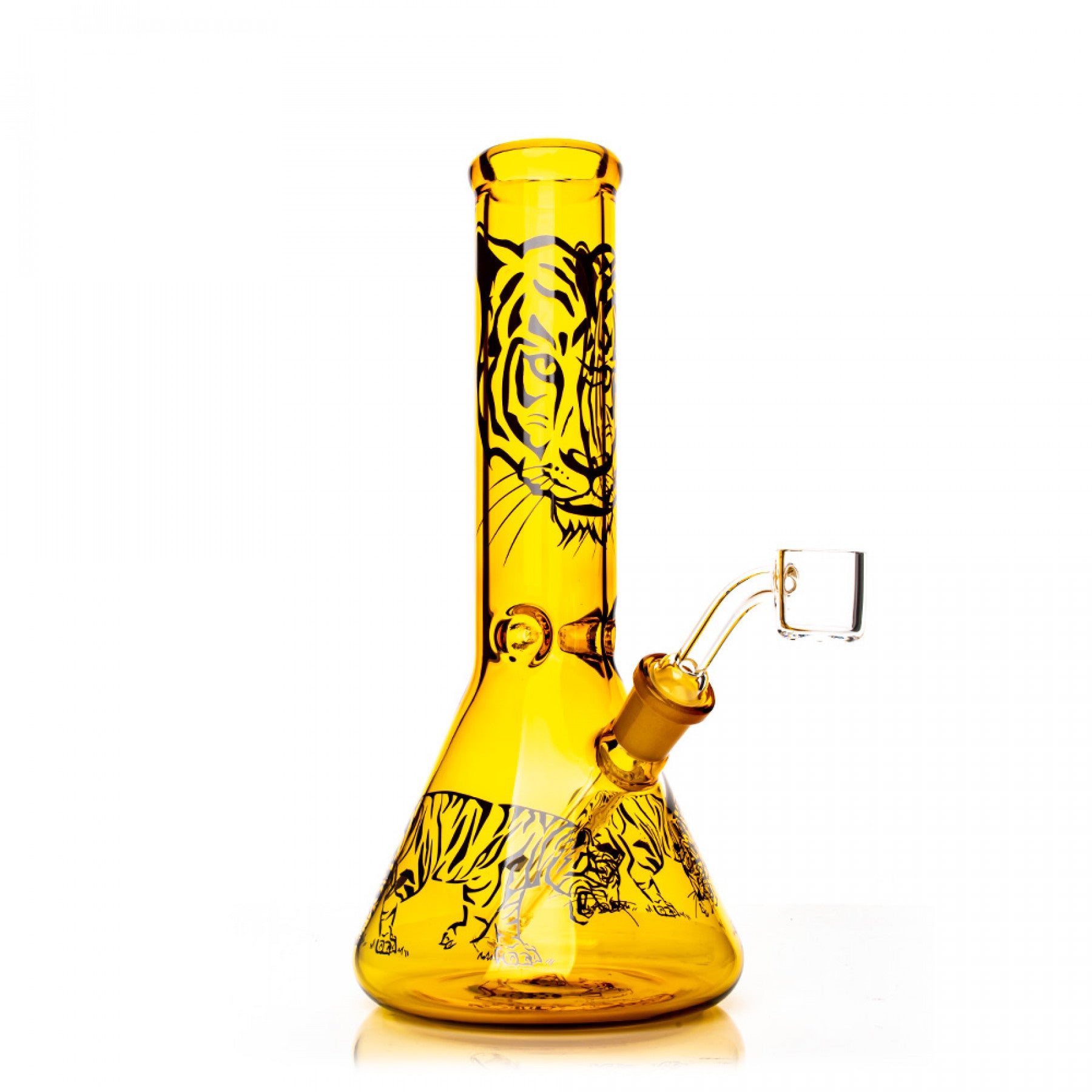 Embrace your wild side with the Honey Gold Tiger Beaker Base Concentrate Rig from RED EYE GLASS®. This fierce piece features a playful decal design, a quartz banger, and a rounded mouthpiece fit for a concentrate king (or queen).
