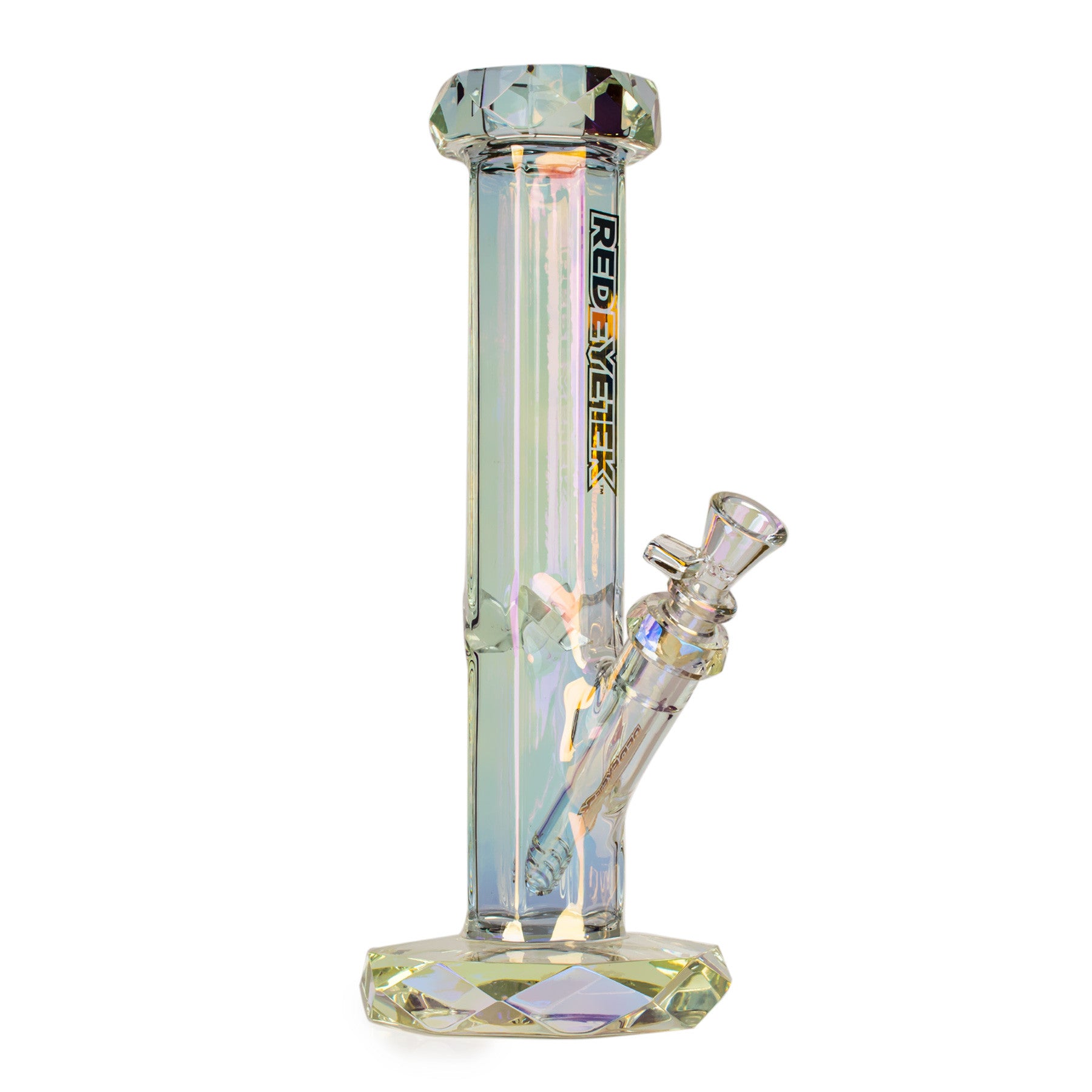 Discover the Terminator Draco Tube from RED EYE TEK®, crafted with weighted 100% borosilicate glass to elevate your smoking experience. This unique bong boasts an unparalleled facetted design and a mesmerizing iridescent metallic finish.