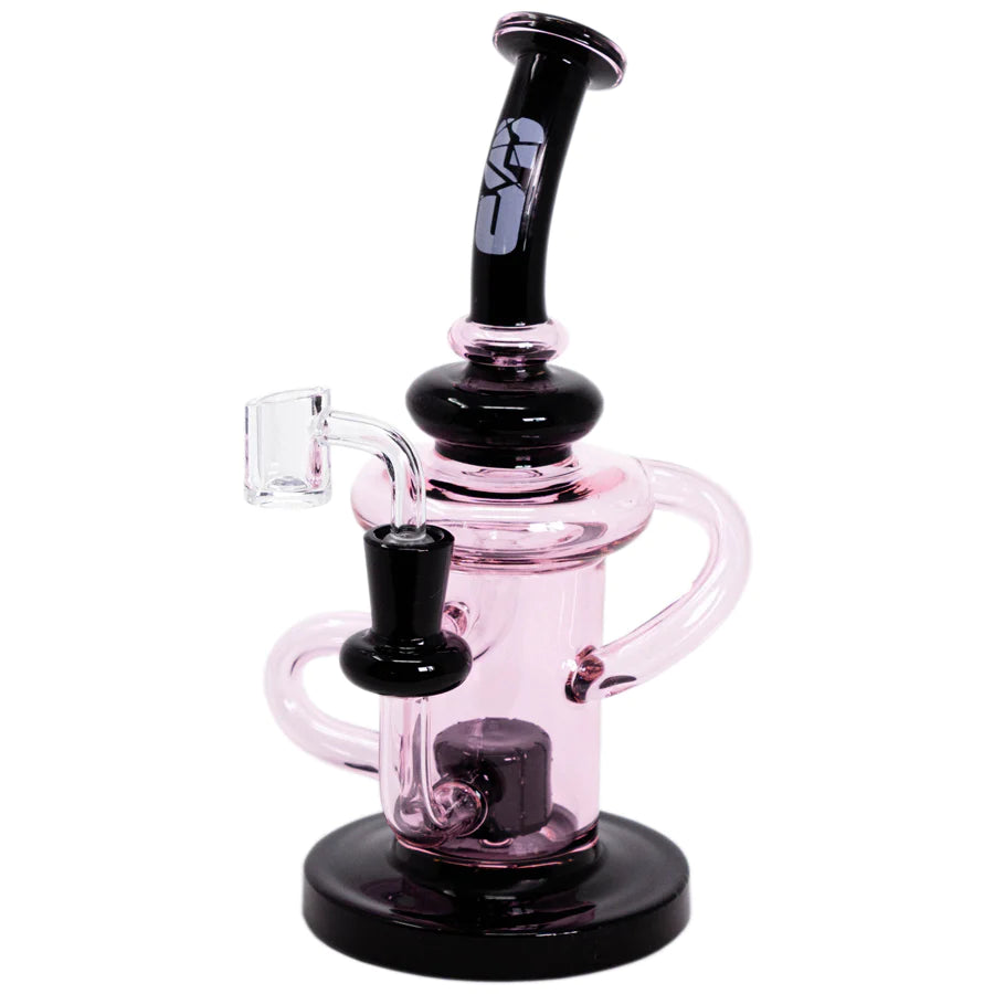 This two-toned recycler by Shatter'd stands 9'' tall! It has a ufo percolator attached to its in-line stem for added smoothness. After your smoke passes through the built in percolator, the "recycler" action happens when your water is pulled through the protruding tubes and pushed back into the base. This design provides dabbers with better filtration while cooling and preserving optimal flavour.