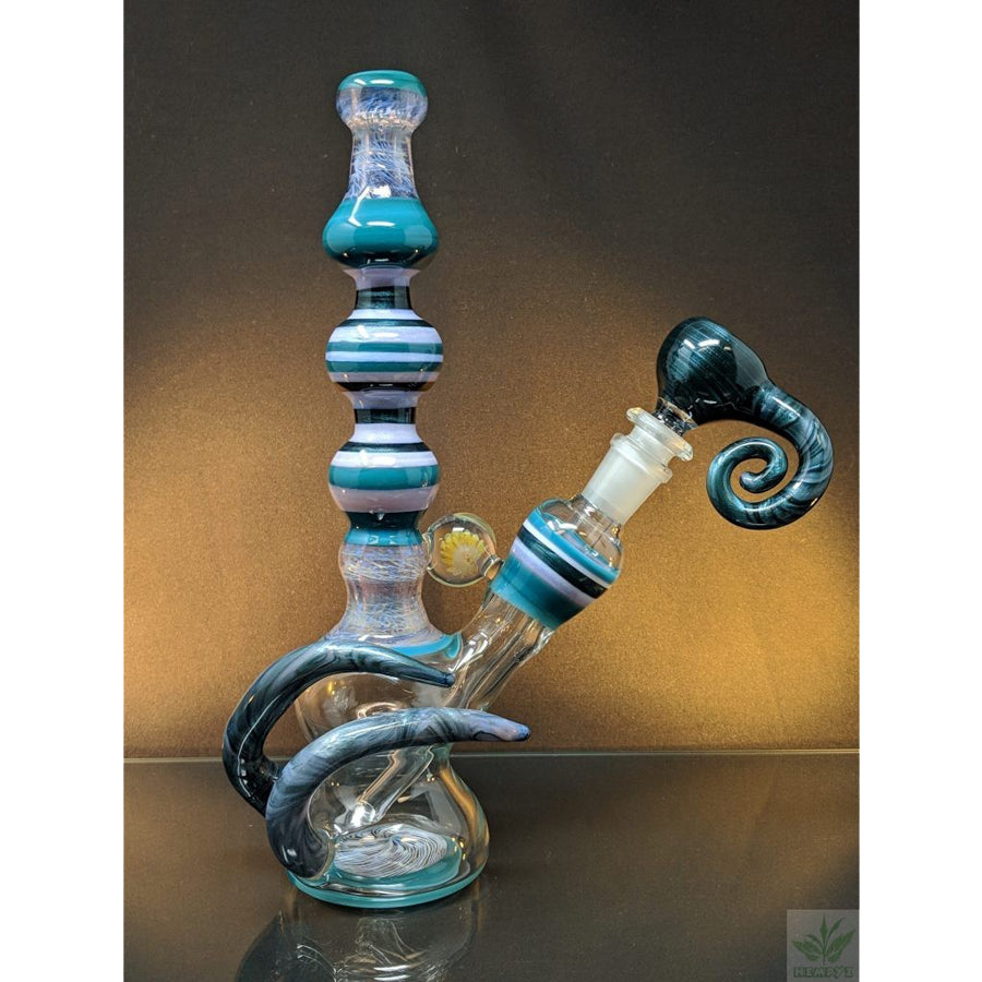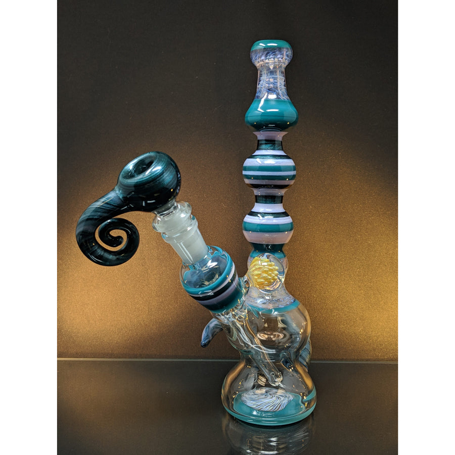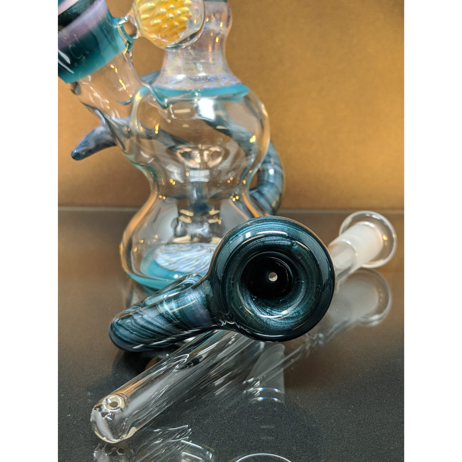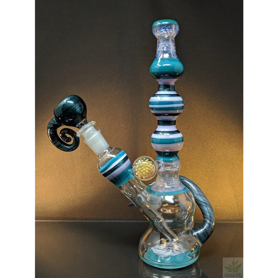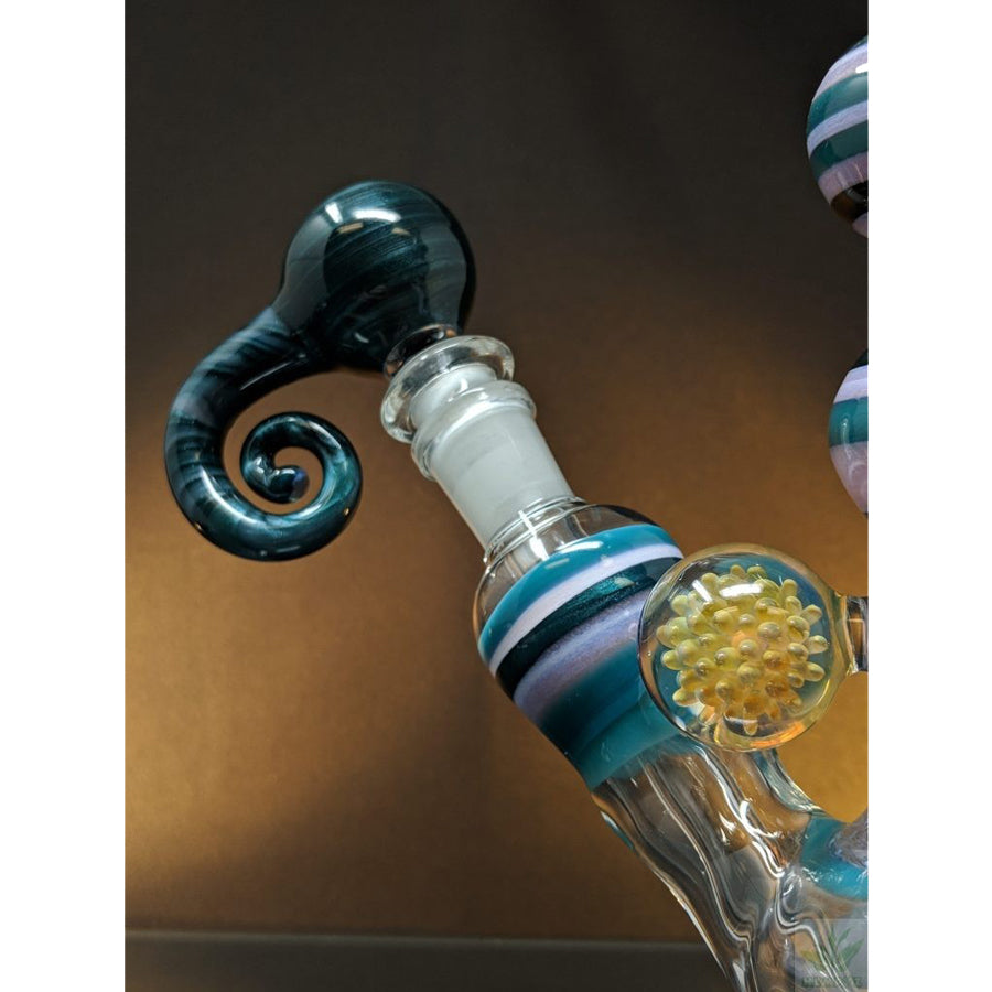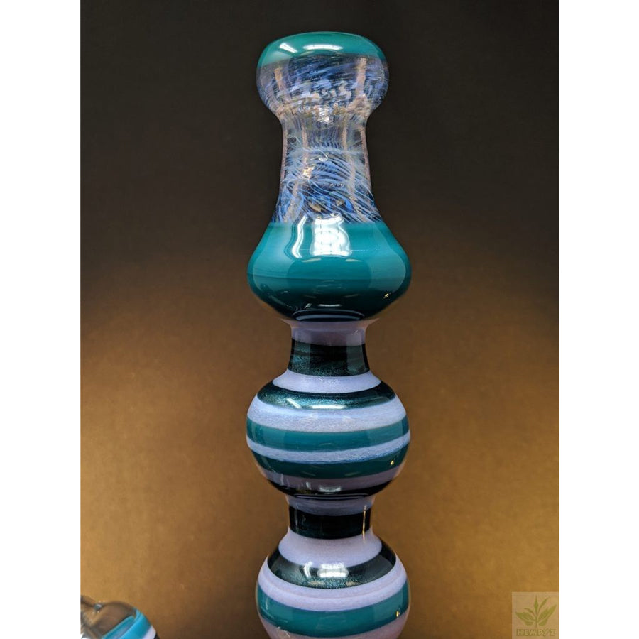 Shine Glassworks heady bong with encalmo sections, latticino sections and an implosion marble. Comes with a matching 14mm bowl. Stands approximately 11.5'' tall.