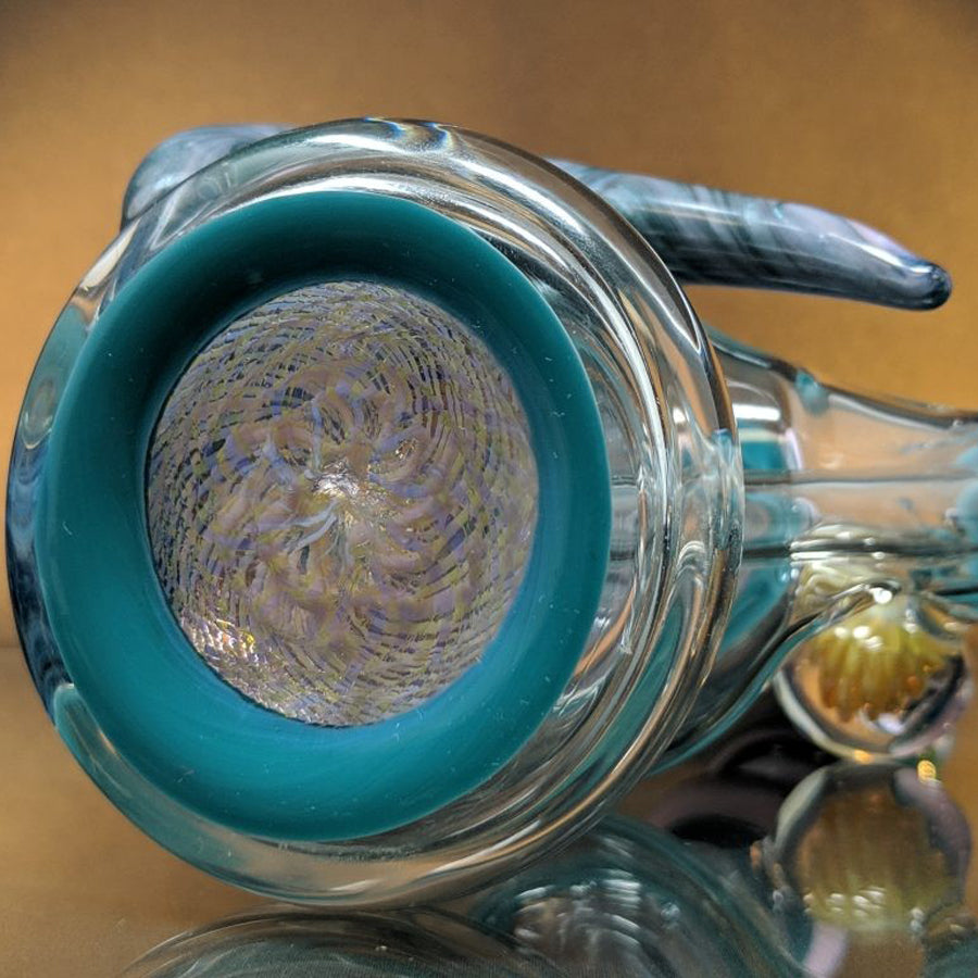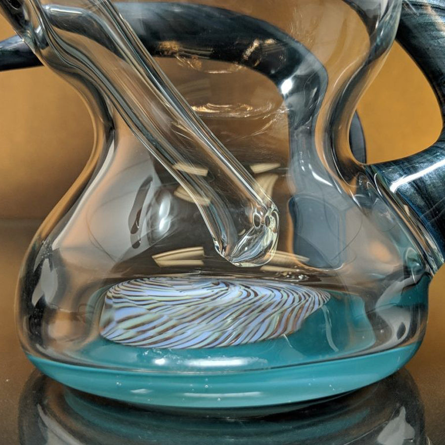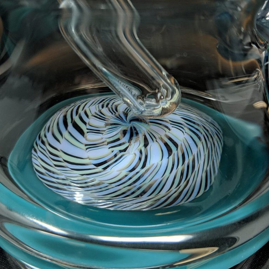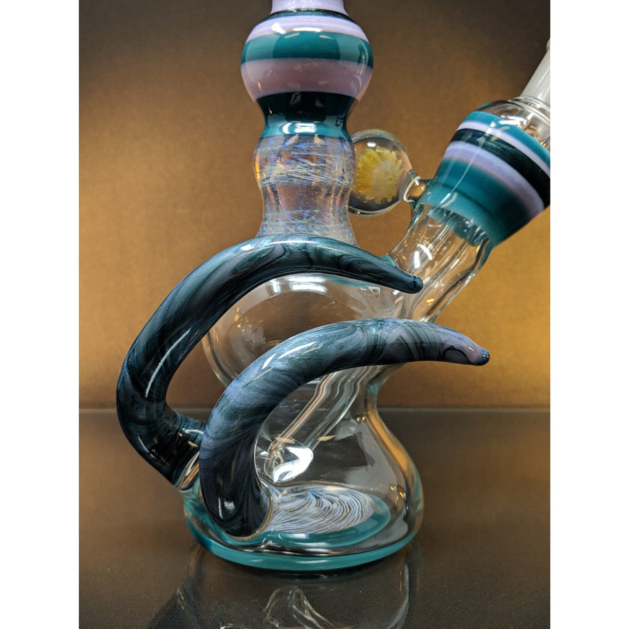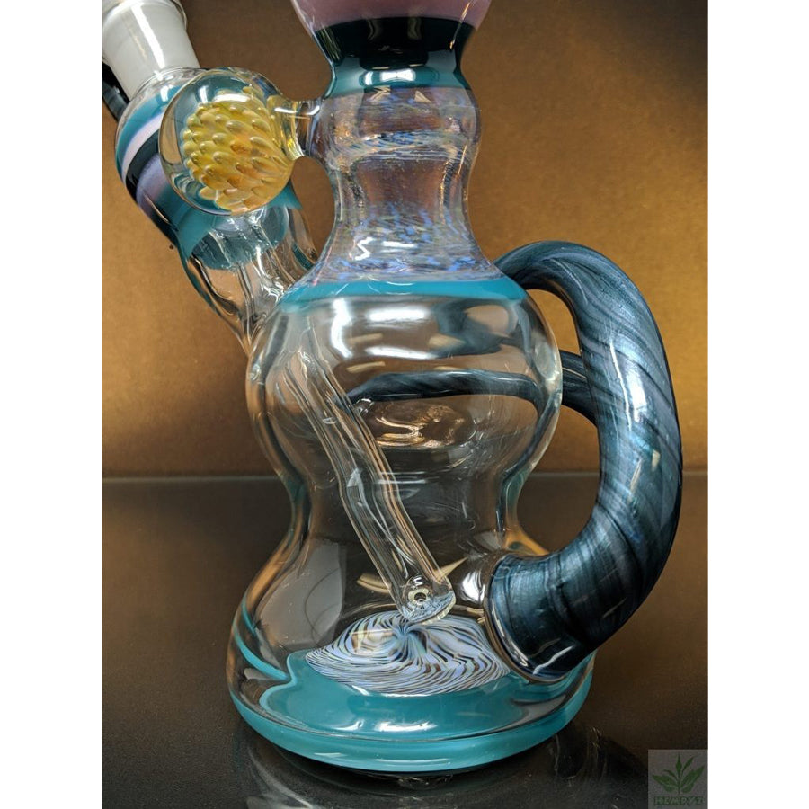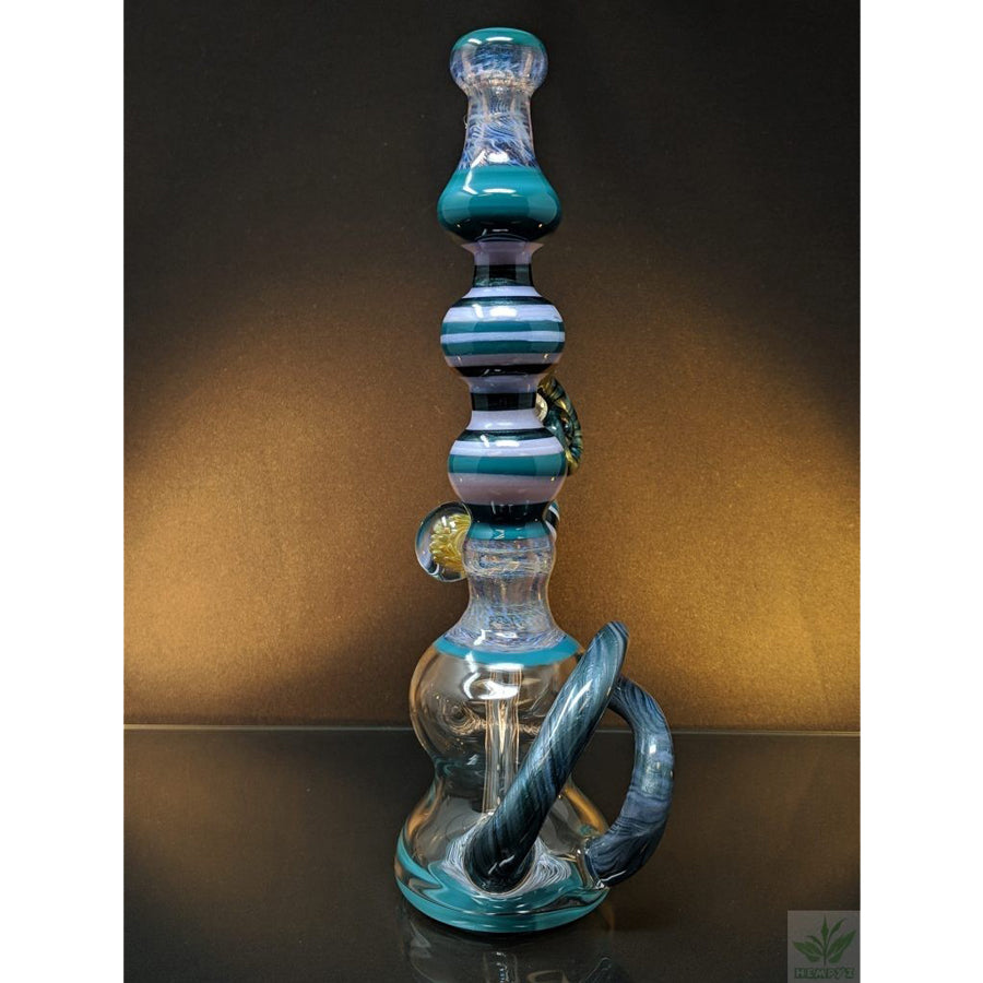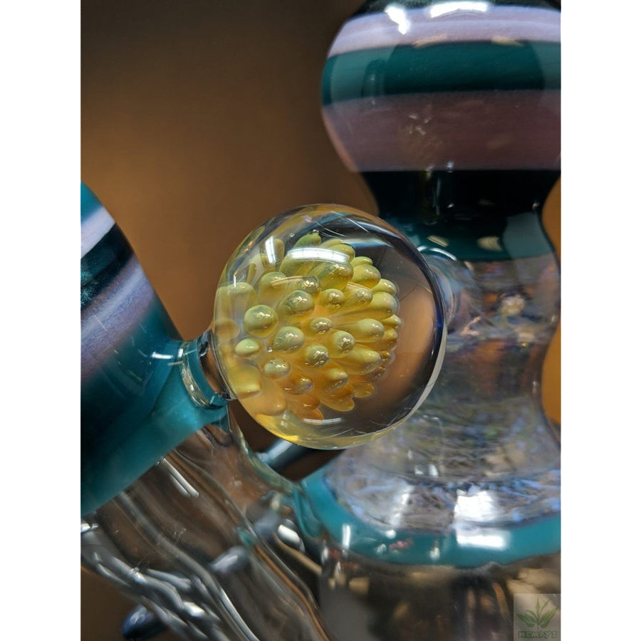 Shine Glassworks heady bong with encalmo sections, latticino sections and an implosion marble. Comes with a matching 14mm bowl. Stands approximately 11.5'' tall.